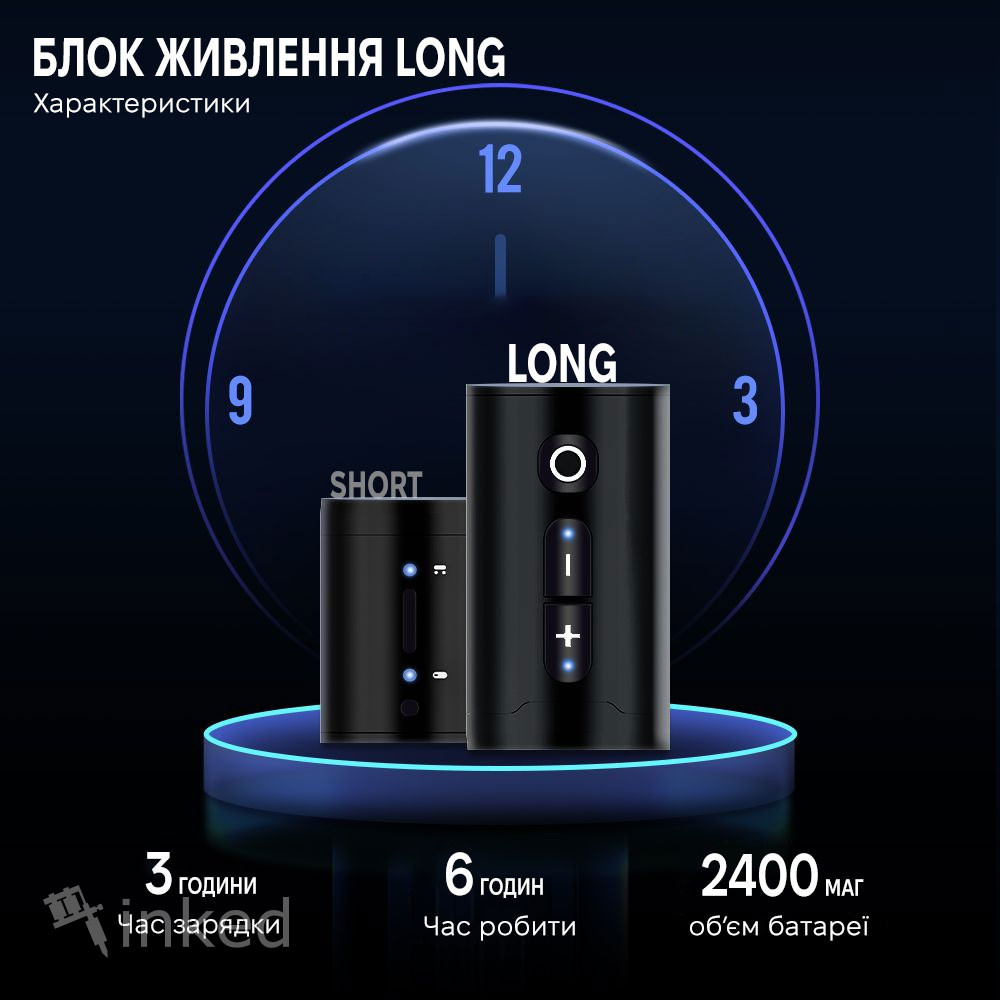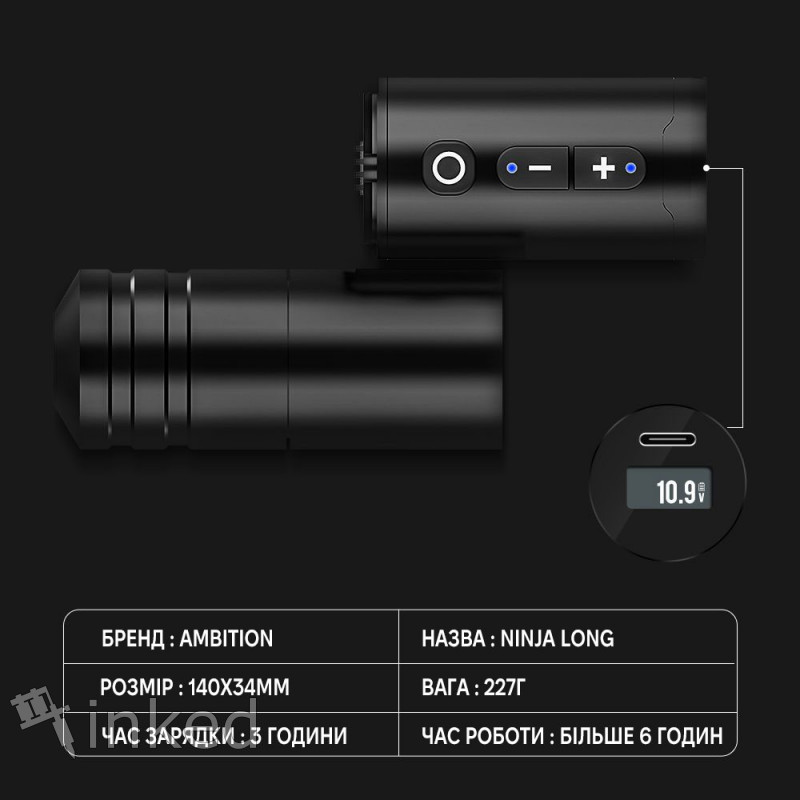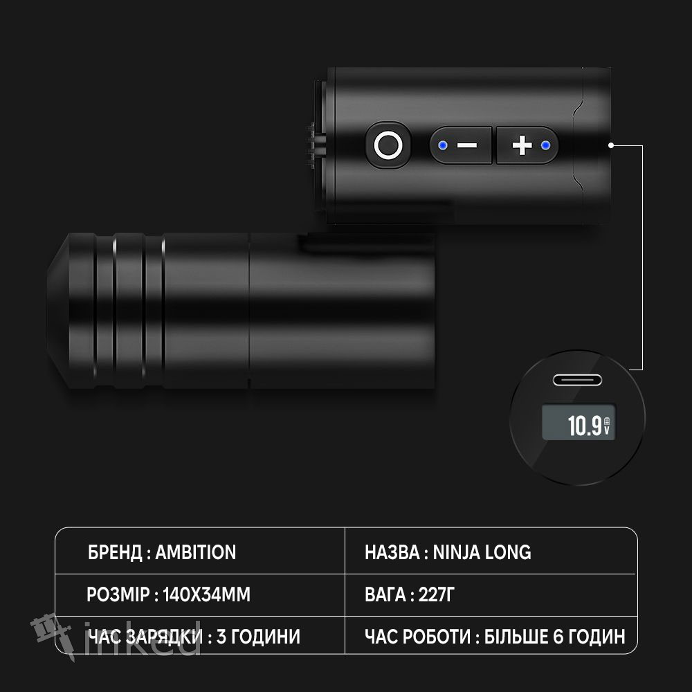 Ninja Tattoo Machine LONG - универсальная беспроводная машинка, тихая и с минимумом вибраций. Подходит как для лайнинга и шейдинга, так и для плотной зарисовки. Совместима со всеми стандартными картриджами.
