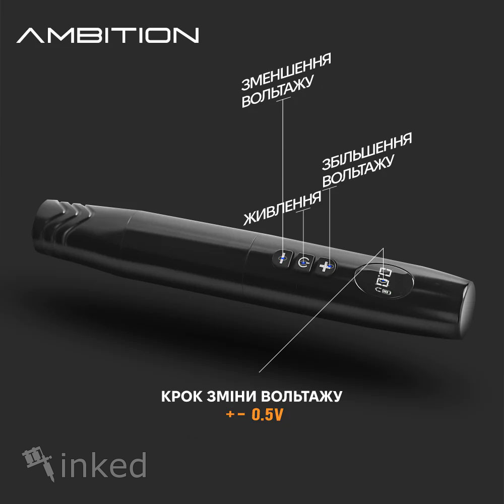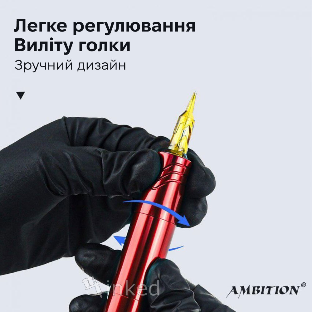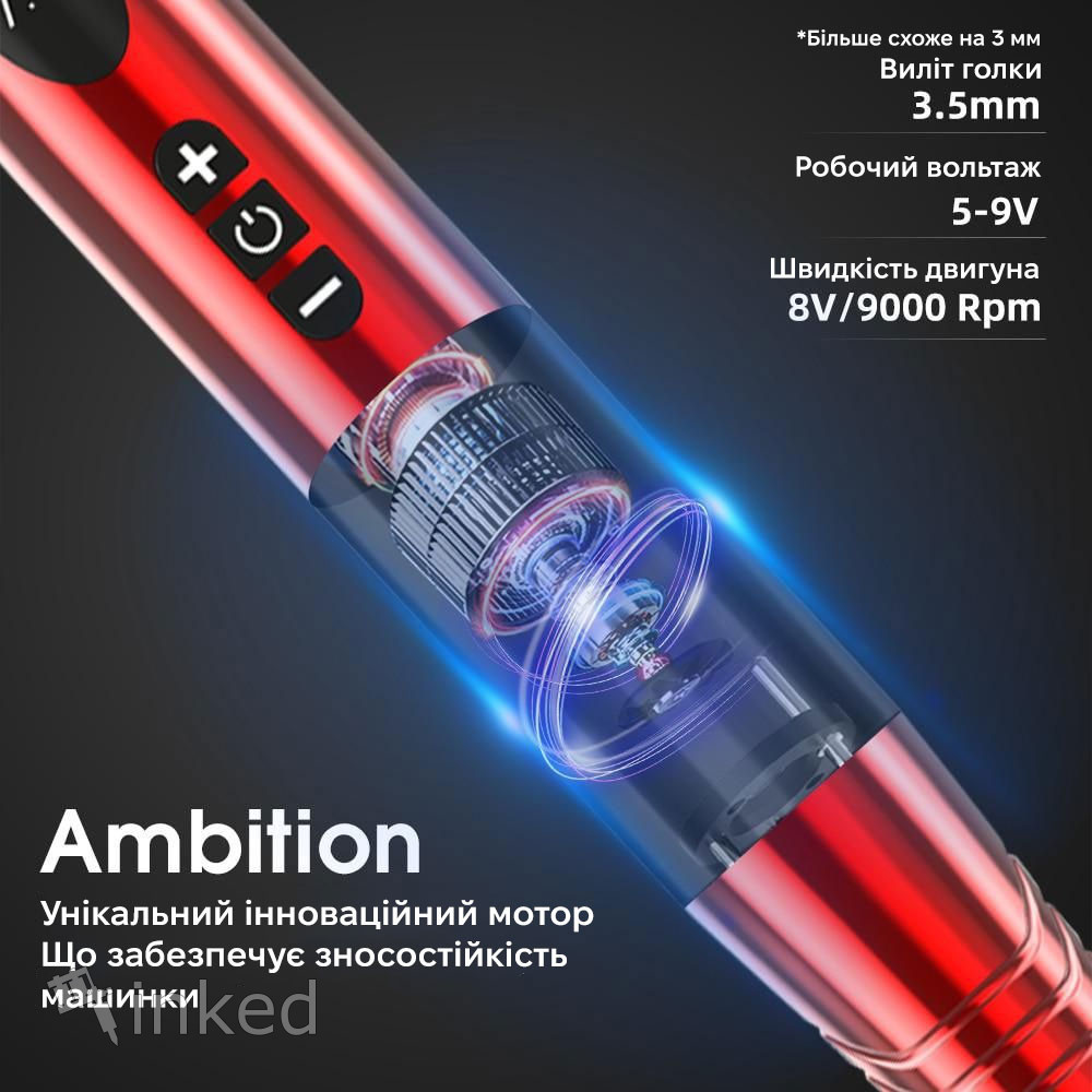 В середине машинка оснащена бесколлекторным двигателем Ambition Coreless, скорость двигателя 8 V - 9000 об/мин. Мощный двигатель обеспечивает быстрое вбивание краски, меньше травмирует кожу и не нагревается в течение длительного времени работы.