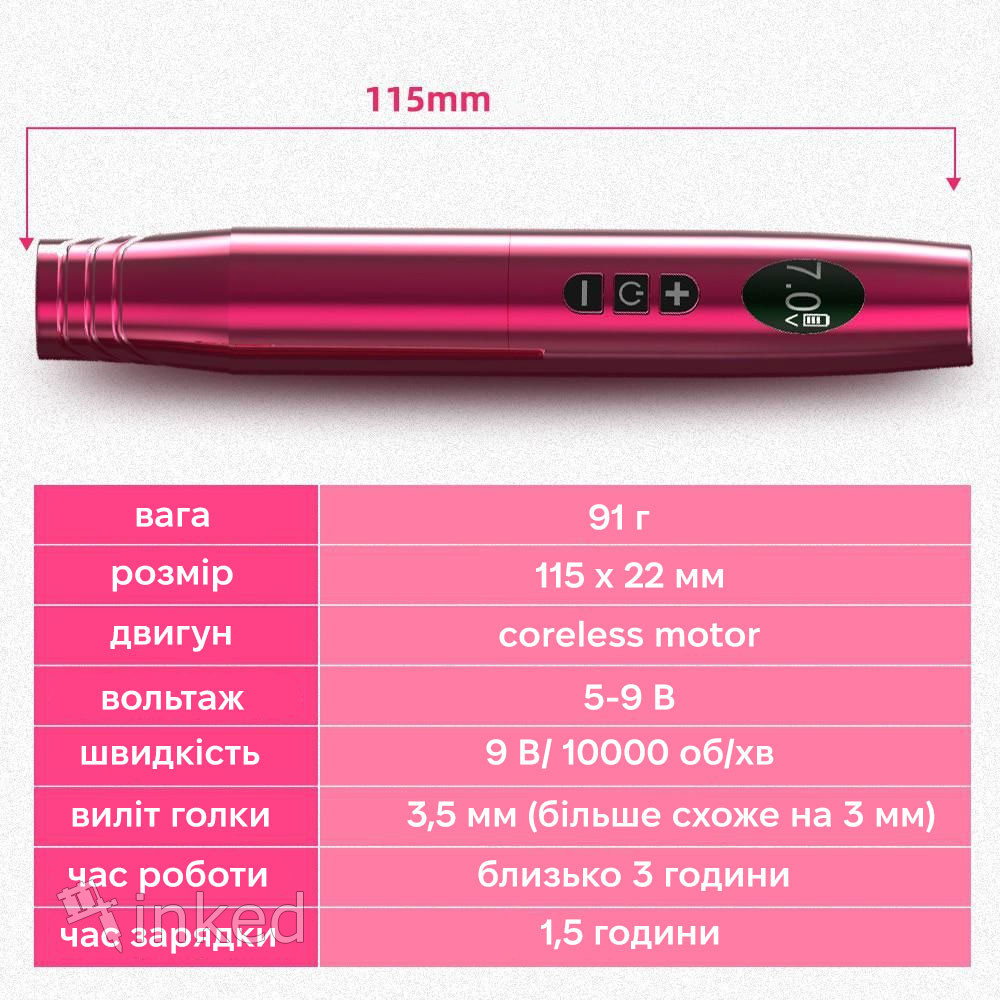 Вылет иглы составляет по информации от производителя составляет 3,5 мм, однако в реальности больше похоже на 3 мм. Dragonkiss G1 имеет усовершенствованную систему передач, которая обеспечивает надежную, тихую работу и меньше вибраций, износостойкость, длительное использование без деформации и длительный срок службы. Идеально подходит для перманента губ, бровей, век и небольших татуировок. Совместима со всеми стандартными картриджами.