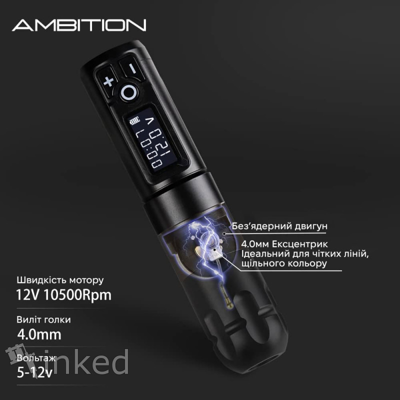 В середине машинки находится кастомный Ambition Coreless двигатель, что на 10V выдает 9000 об/мин. Мощности хватает как для тонких линий, так и для плотного нанесения цвета.