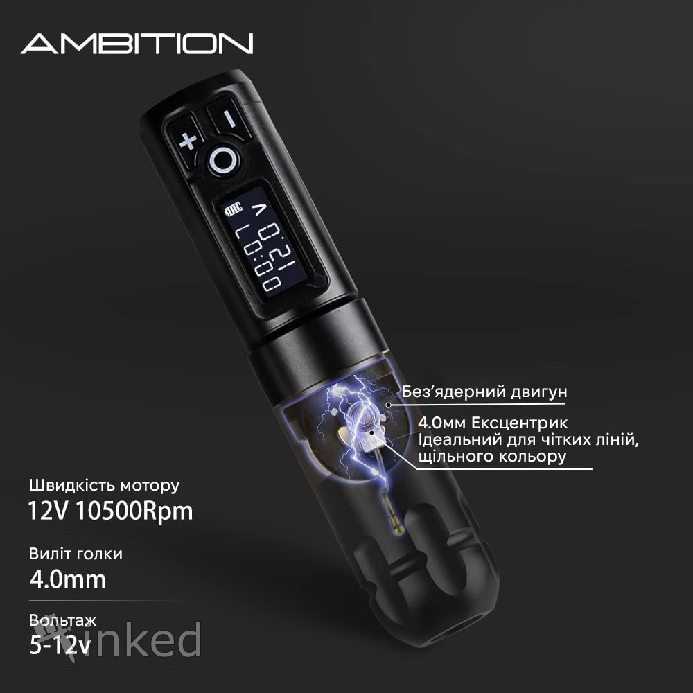 Ambition Soldier Tattoo Machine - универсальная беспроводная машинка, тихая и с минимумом вибраций. Подходит как для лайнинга и шейдинга, так и для плотной зарисовки. Совместима со всеми стандартными картриджами.
