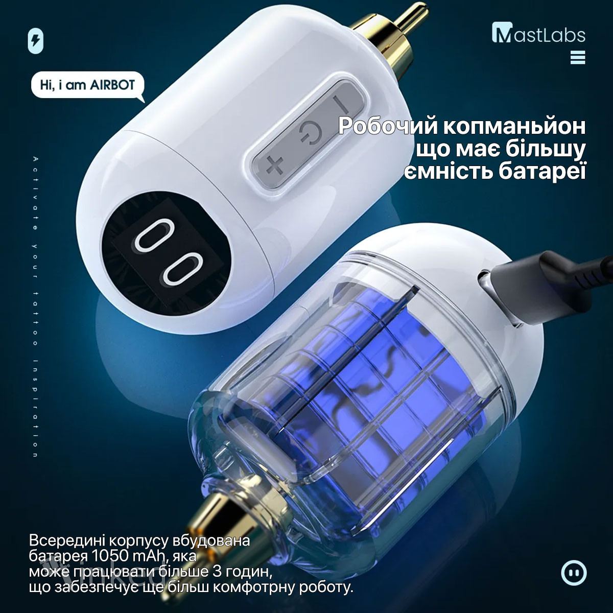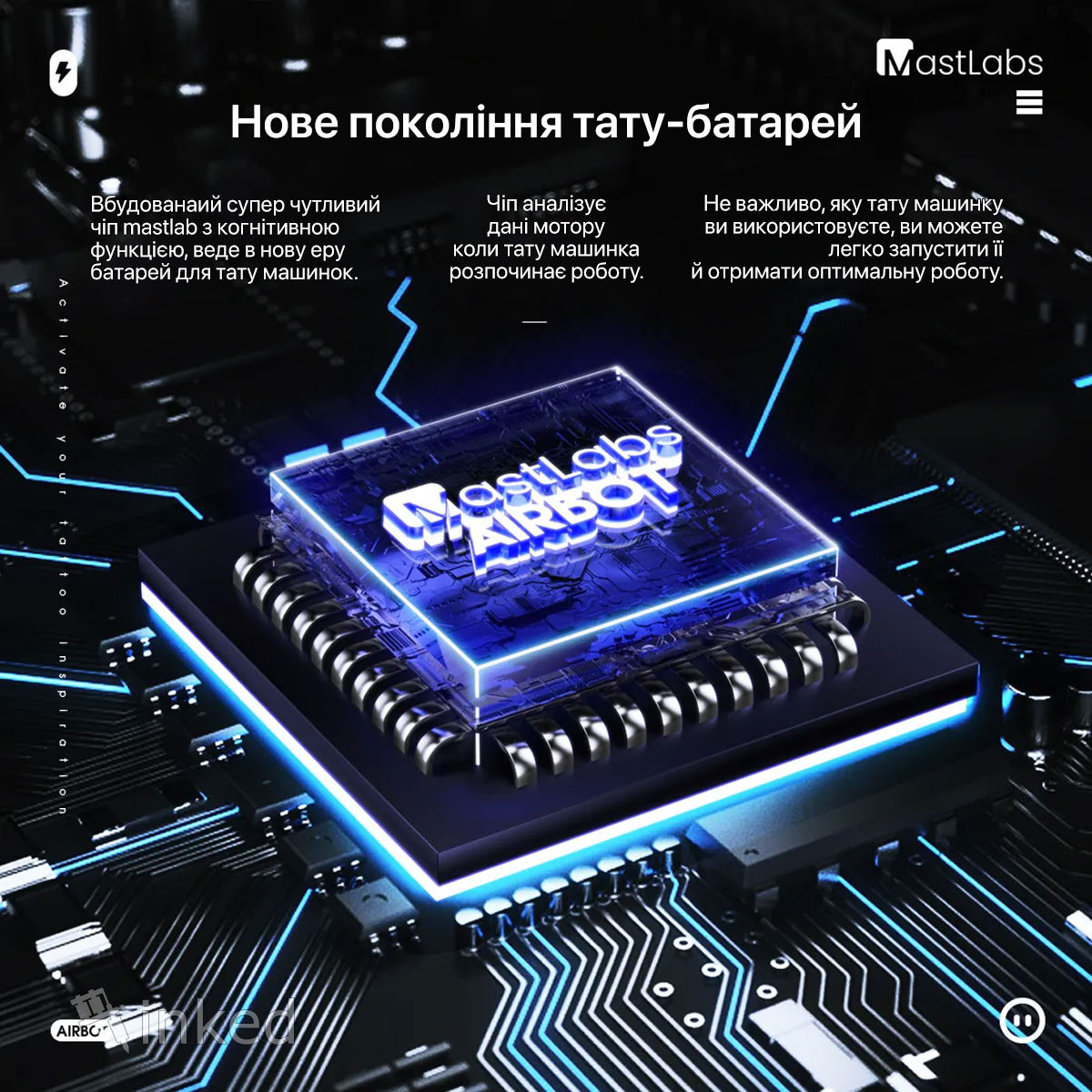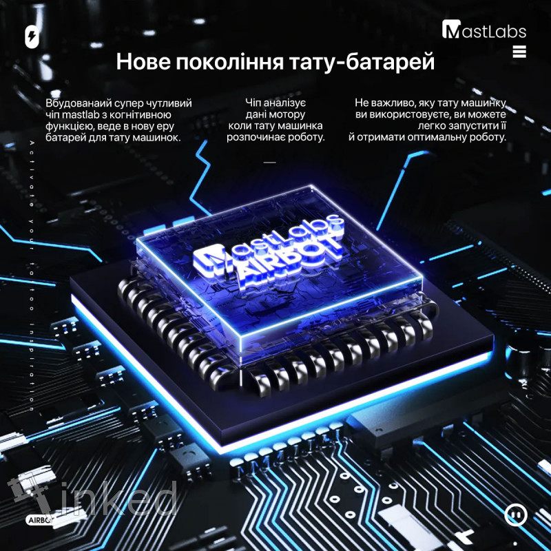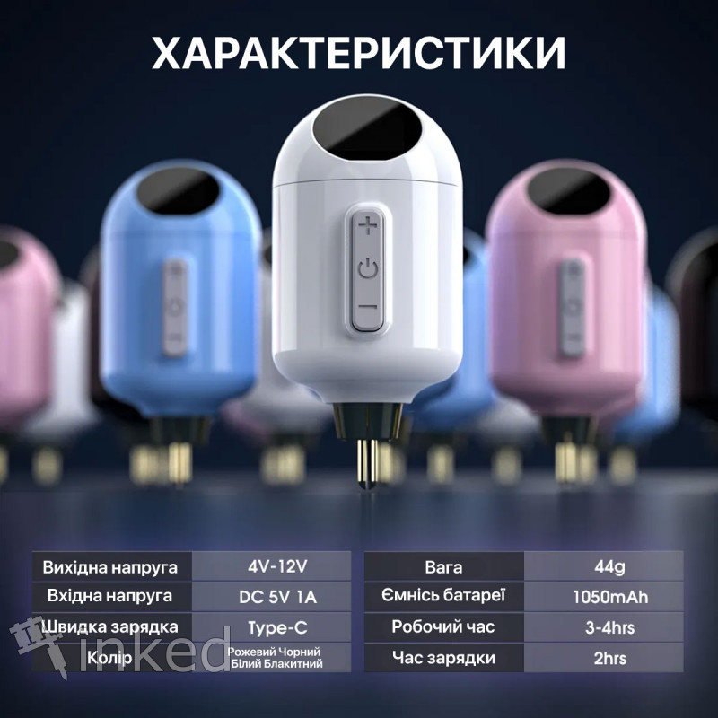 Внутри - умная батарея, которая действительно понимает вашу тату-машинку и ваши потребности.