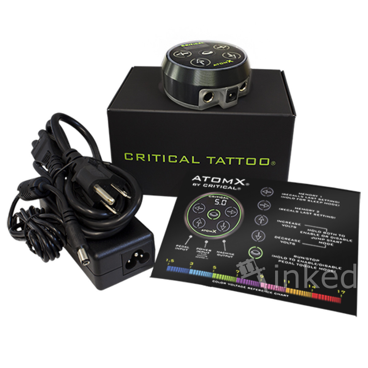 Блок питания Critical AtomX работает с любыми индукционными и роторными тату машинками. Встроенные магниты и силиконовые вставки позволяют пользоваться блоком на любых поверхностях.