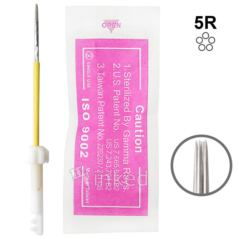 Модель 5R оснащена пятью микроиглами, которые сведены в один пучок. Комбинированная игла с круглой пайкой имеет длину 4,7 см. Уникальная конструкция позволяет мастеру татуажа контролировать ход иглы с высокой точностью. Также изделие оснащается специальным протектором, который защищает кожу от попадания на нее пигмента.