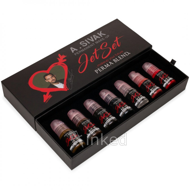 Perma Blend Jet Set [A. Sivak] – профессиональный сет пигментов для перманентного макияжа. Этот набор состоит из 6 цветов для бровей, губ и век, а также разбавителя.
