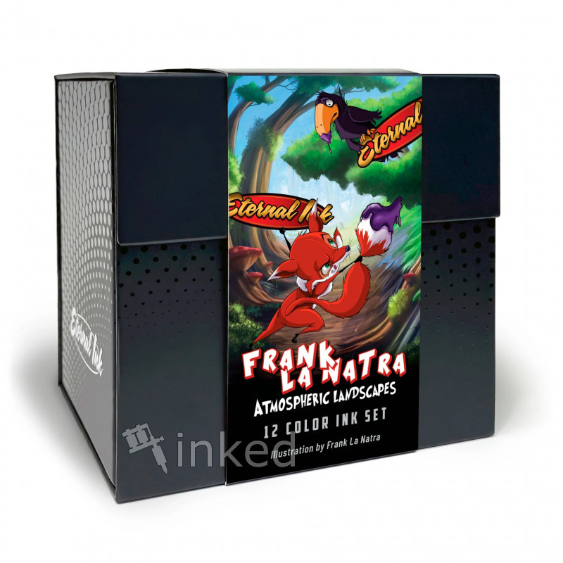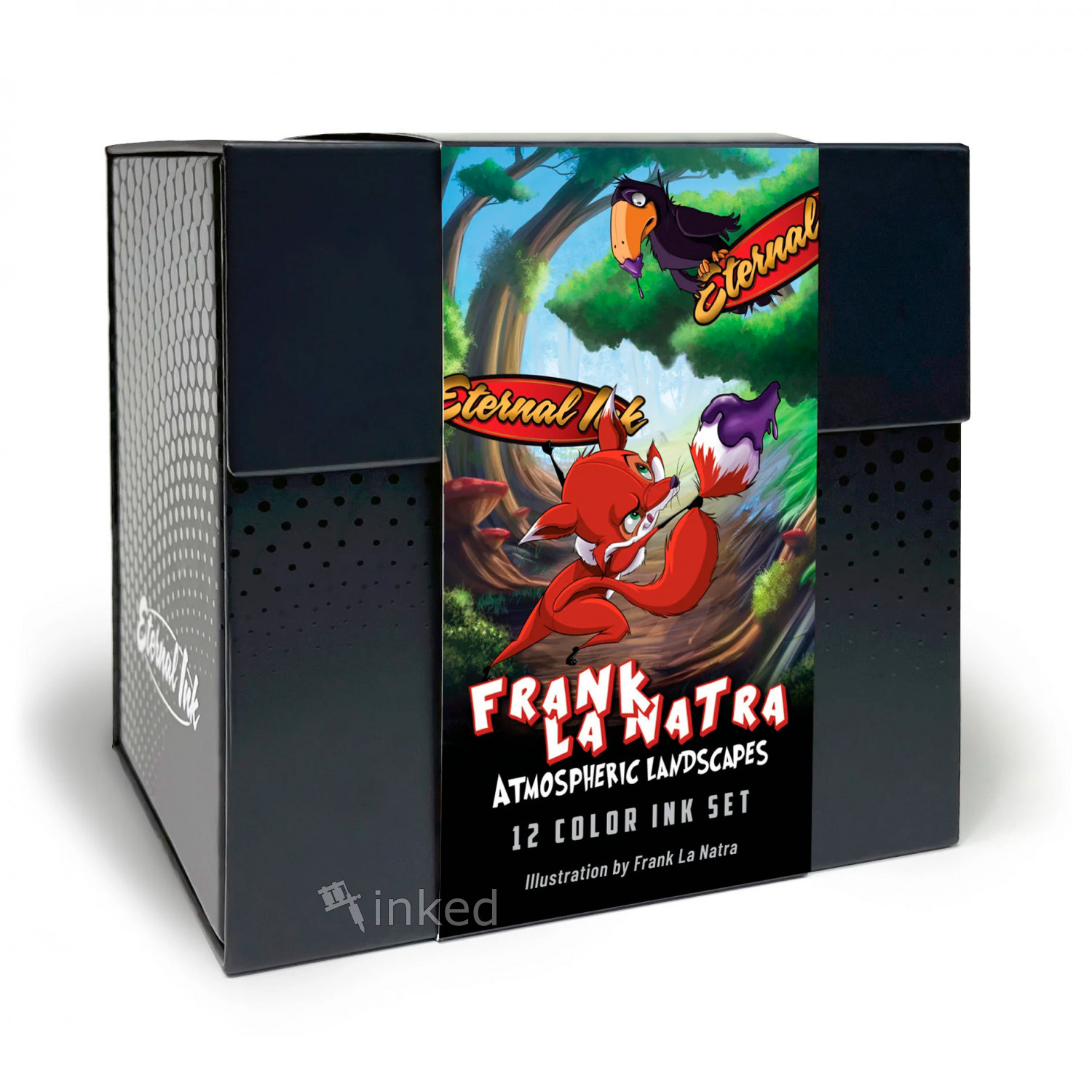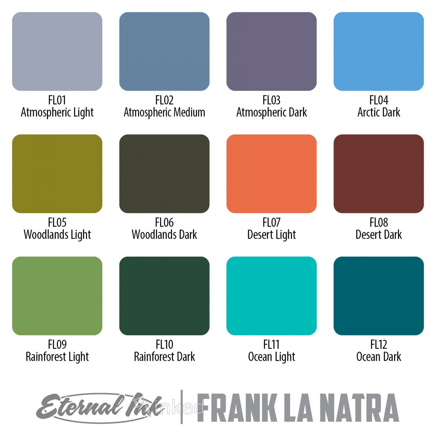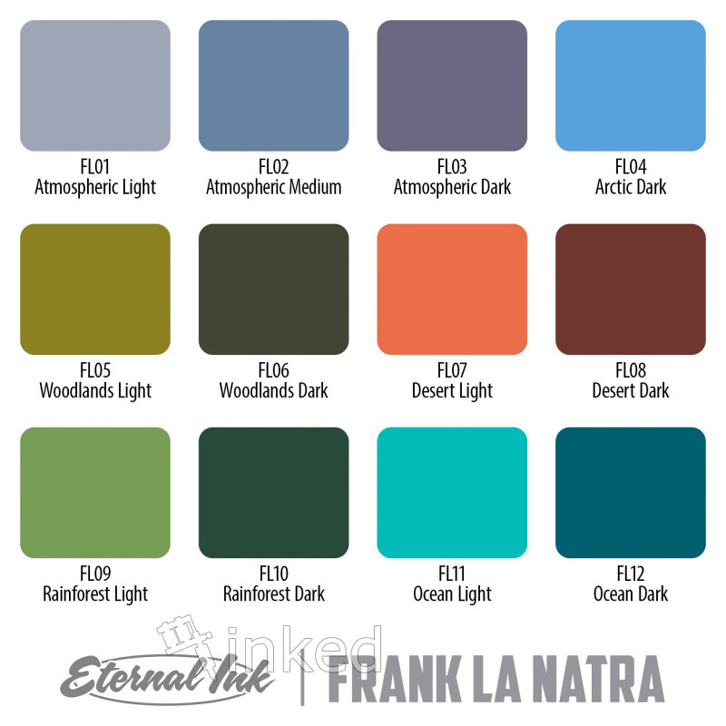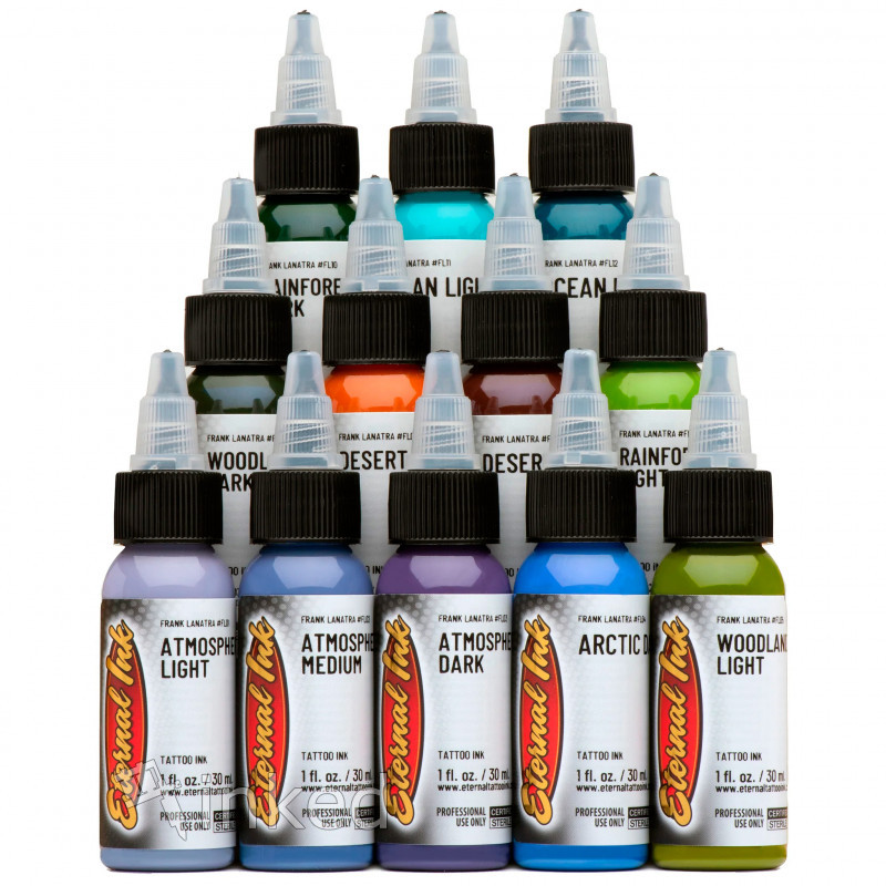 Набор красок для татуировок «Frank La Natra Atmospheric Landscapes 12» от Eternal Ink – это набор из 12 ярких пигментов, которые помогут нарисовать на коже настоящую сказку. Сет включает атмосферные оттенки фиолетового, кардинально противоположные оттенки зеленого, яркие и тусклые оттенки синего и голубого, а также баночку с коричневой и оранжевой красками.