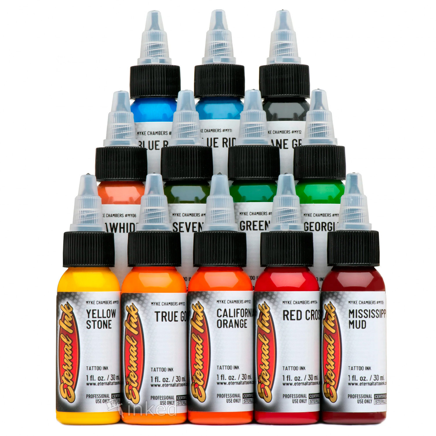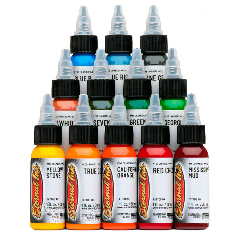 Сет красок для татуировок «Myke Chambers Signature Set 12» от Eternal Ink – набор из ярких и максимально контрастных оттенков от известного американского тату-мастера Майка Чемберса. Этот набор обязательно должен попасть в коллекцию профессионала, который любит олдскульные рисунки, а также не боится использовать светлые и яркие пигменты.