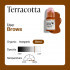 Отже, Terracotta може застосовуватися на бровах для перекриття сірих і синьо-сірих відтінків. Його можна додавати для нейтралізації сірості в будь-який коричнево-русявий і русявий пігмент при жирності шкіри. Так само цей пігмент може застосовуватися при складанні міксів. Дуже добре працює з сірими і оливковими квітами.