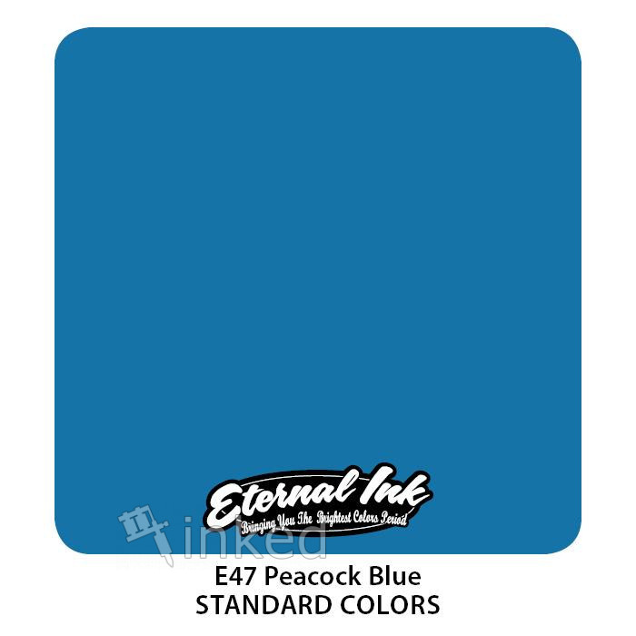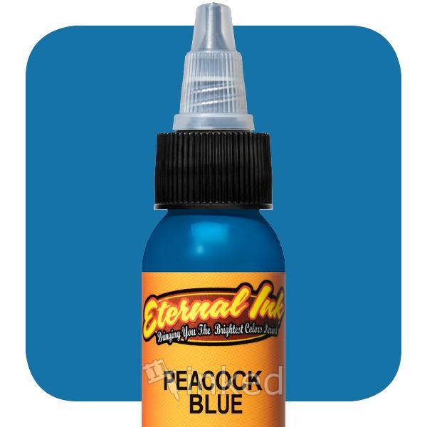 Peacock Blue-м'який синій відтінок від Eternal. Колір, без якого ніяк не обійтися. Використовується для портретів, пейзажів. Змішуючи з білим, Плавні переливи цього відтінку можна гармонійно використовувати для монохромних тату. Дуже добре поєднується з синіми пігментами. В роботі надає обсяг і глибину. Чистий, яскравий, безпримісний синій колір, володіє після загоєння атласним блиском і відмінно виглядає на шкірі.