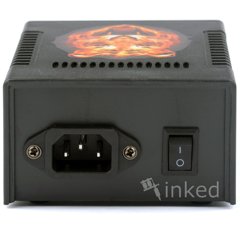 Блок живлення має два входи для педалі включення і кліпкорда, а так само цифровий дисплей. З нижньої сторони розташовані протиковзкі гумові накладки. Блок легко регулює потрібну вам напругу, забезпечуючи потужний і стабільний струм для роботи тату-машинки. Зручний у використанні.