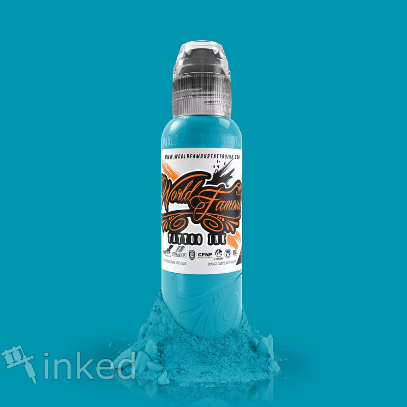 Algarve Aqua – цвет голубой воды от World Famous Tattoo Ink. Бирюзово-синий, аквамарин. Нерезкий, но цельный оттенок. Пигмент средней густоты. Это качественная американская тату краска с высоким содержанием пигмента. Легко вбивается и хорошо заживает.