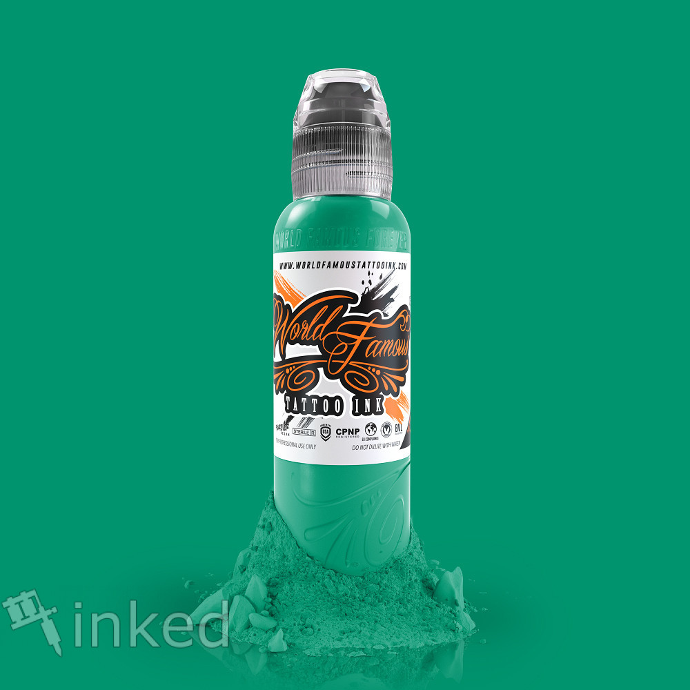Сине-зеленый цвет Карибского моря от World Famous Tattoo Ink. Цвет этого тату пигмента практически зелёный с небольшой долей синего, зелёная бирюза. В некоторых уголках карибского бассейна с песчаным дном и густо заросшими берегами возможно встретить воду такого оттенка.