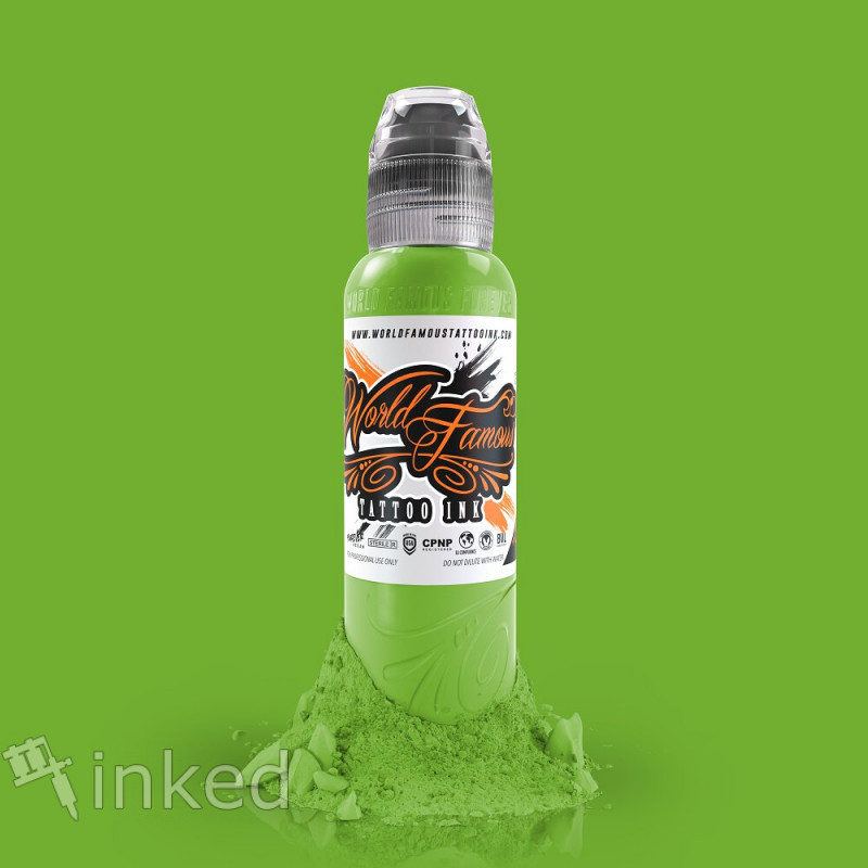 Green Day – ярко-зеленый пигмент, цвет лайма от World Famous. Темное зеленое основание, в составе присутствует желтый цвет. Это качественная американская тату краска с высоким содержанием пигмента. Легко вбивается и хорошо заживает.