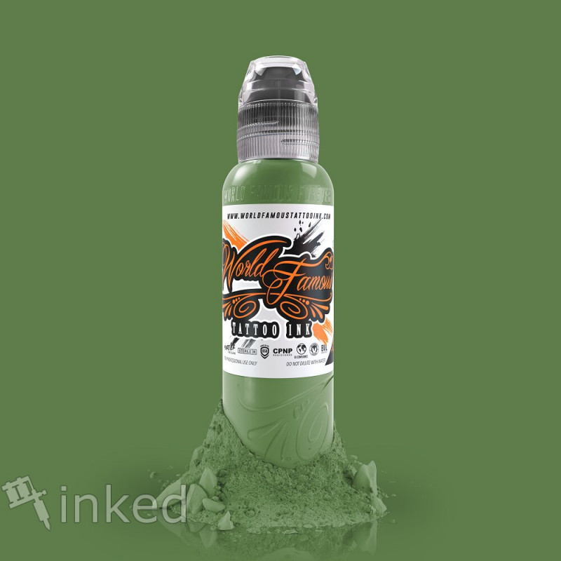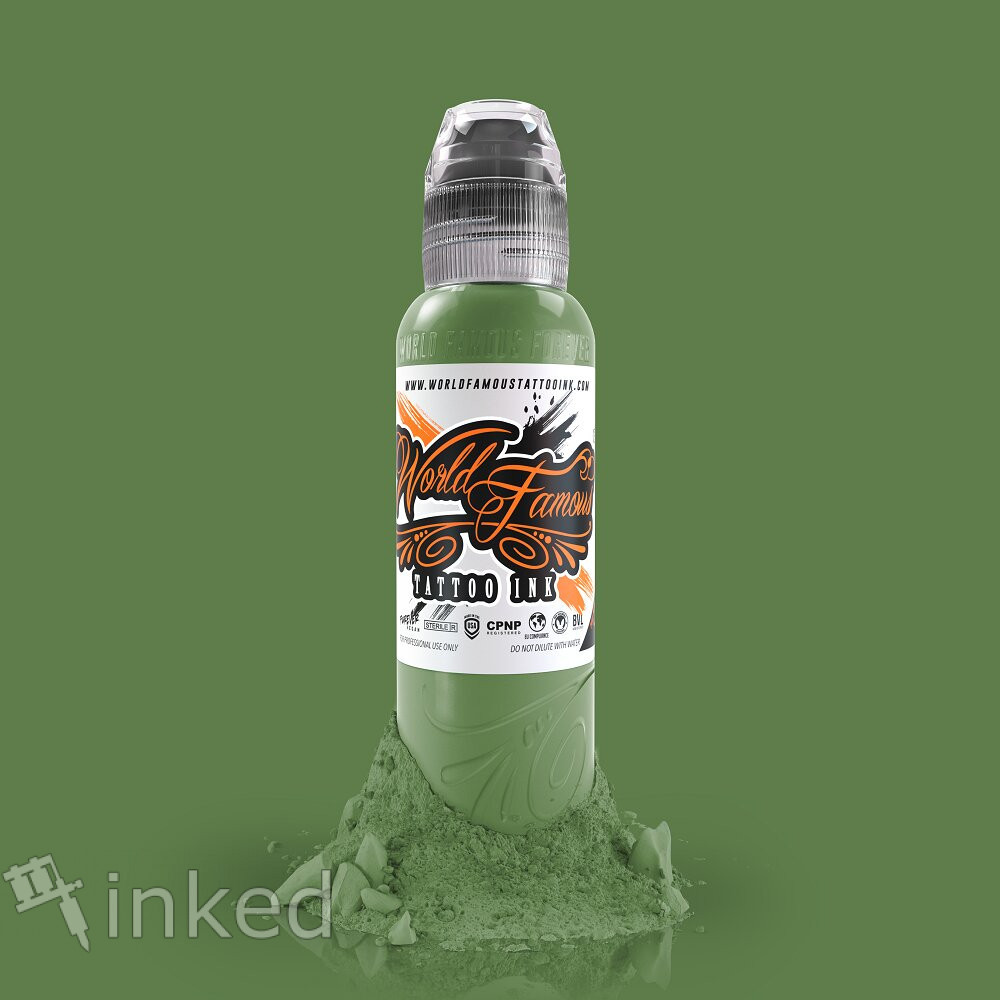 Medium Green – приглушенный зелёный цвет от World Famous. Входит в набор A.D. Pancho Color set. Это качественная американская тату краска с высоким содержанием пигмента. Легко вбивается и хорошо заживает.